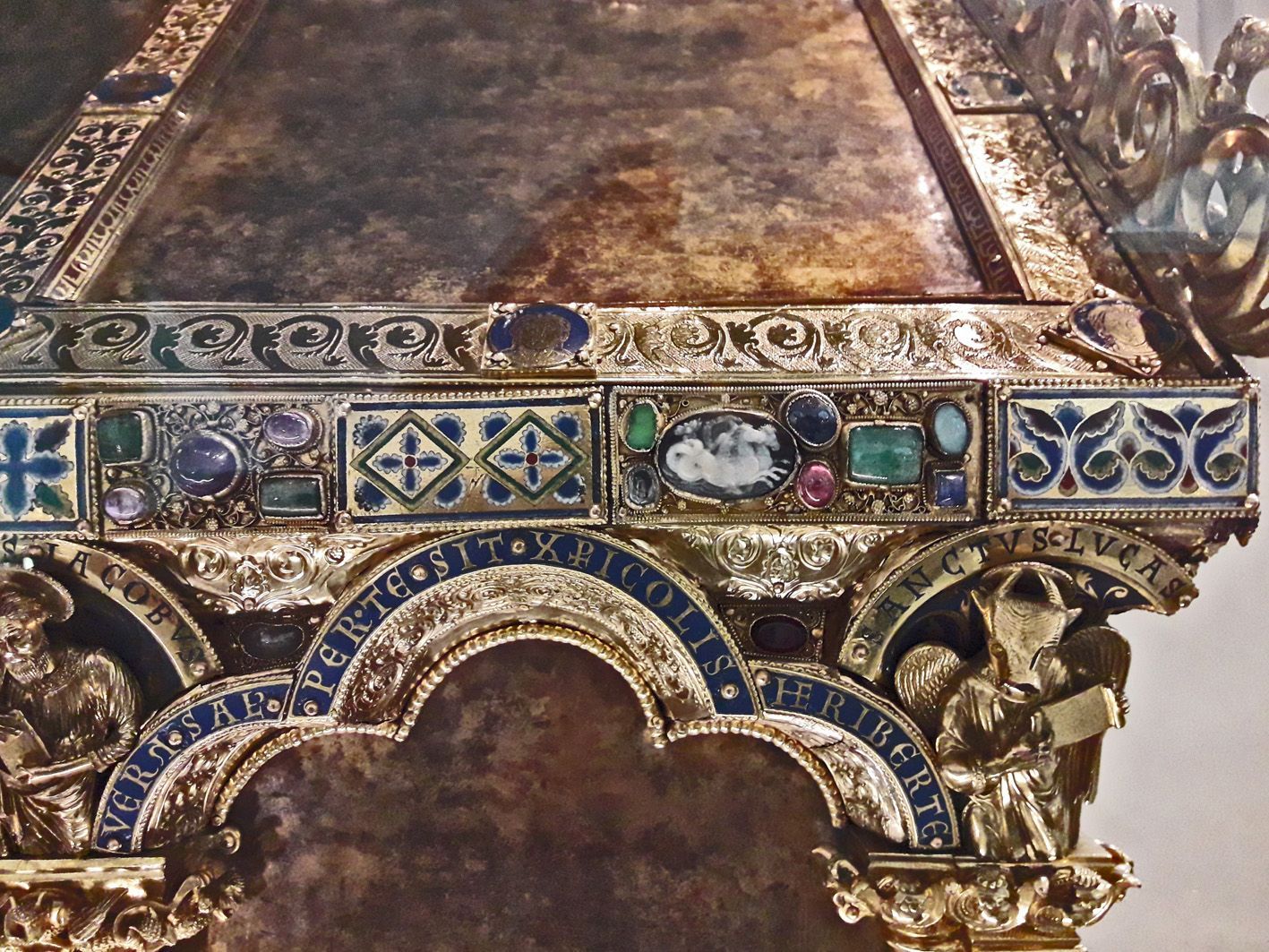 All diese Schätze zeigte uns die Führerin und erläuterte ihre Geschichte. Interessant ist dabei, dass die Servatius-Kirche ursprünglich gar nichts mit der Entstehung des Schatzes zu tun hat. Er entstand nämlich mit den ersten Schenkungen von Reliquien ab 1064 durch den Kölner Erzbischof Anno an seine Lieblingsgründung, die Abtei St. Michael auf dem Michaelsberg. Die Mönche auf dem Berg sammelten über die Jahrhunderte Knochenteile von über 700 Heiligen, die natürlich in entsprechend kostbaren Behältnissen aufbewahrt werden mußten. So entstanden die 5 großen Schreine, von denen der bedeutendste der des hl. Anno ist, und die vielen weiteren kostbaren Gefäße, deren Holzkonstruktionen mit bildlichen Darstellungen aus dem Leben der Heiligen verziert sind, geschaffen aus Gold und Silber und mit kostbaren Edelsteinen verziert. Die große Zahl der Reliquien führte über die Jahrhunderte zu einem bedeutenden Wallfahrtsbetrieb in Siegburg. Die katholischen Gläubigen pilgern seit dem Mittelalter bis heute zu diesem geheiligten Ort und beten vor diesen Schreinen um Schutz und Hilfe in allen Lebensanliegen und um Fürsprache bei Gott - und das seit nunmehr mehr als 950 Jahren.