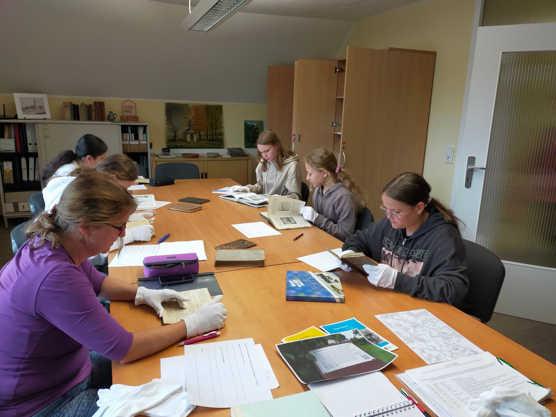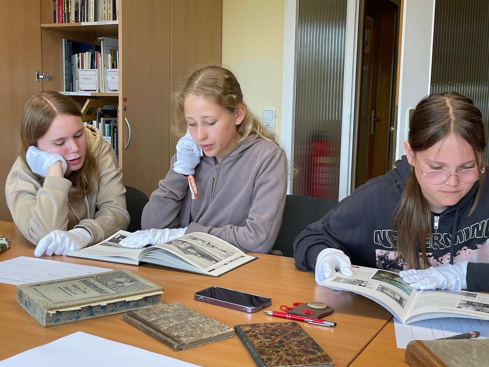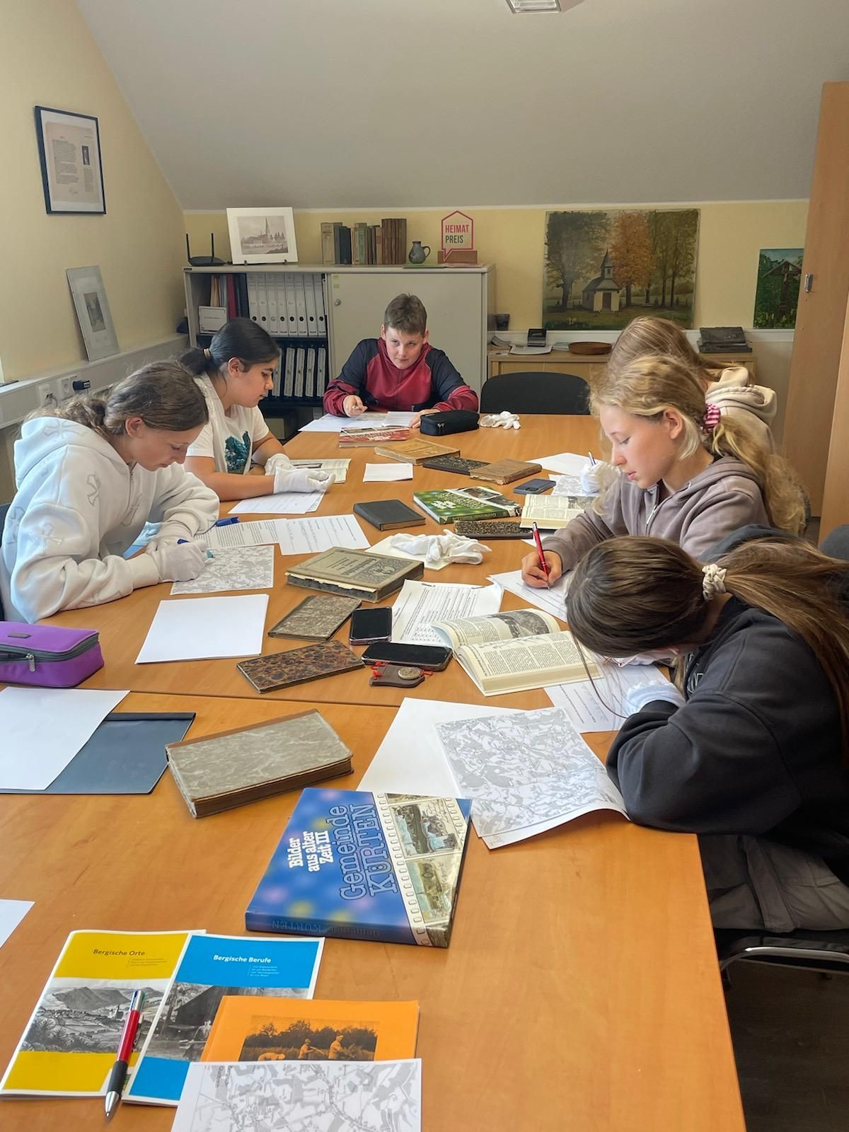 Im Rahmen des Freiday-Projekttages fand sich eine kleine Gruppe von fünf Schülerinnen und einem Schüler mit der Geschichtslehrerin Astrid Wallenfang am 1. Juli in unserem Archiv ein. Sehr interessiert und behutsam schauten sie sich unsere ältesten Schätze und die Bildbände von Kürten in früheren Zeiten an.