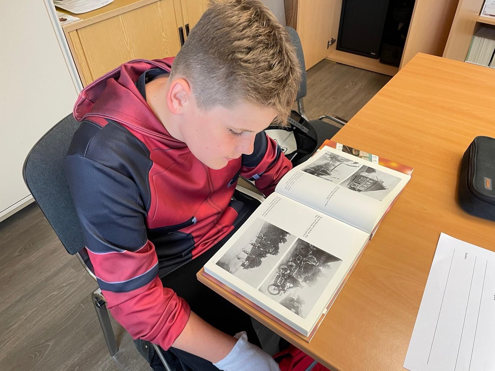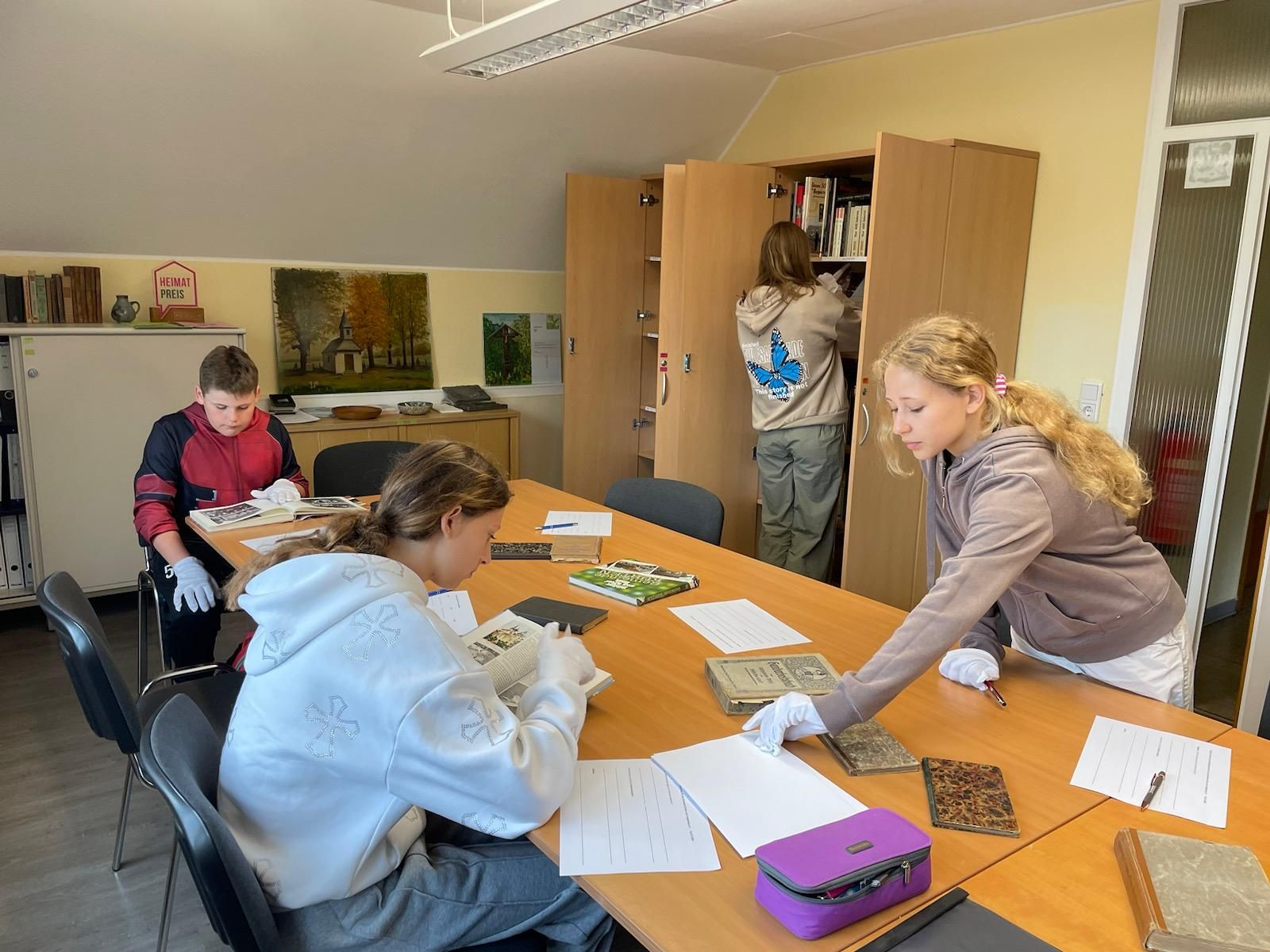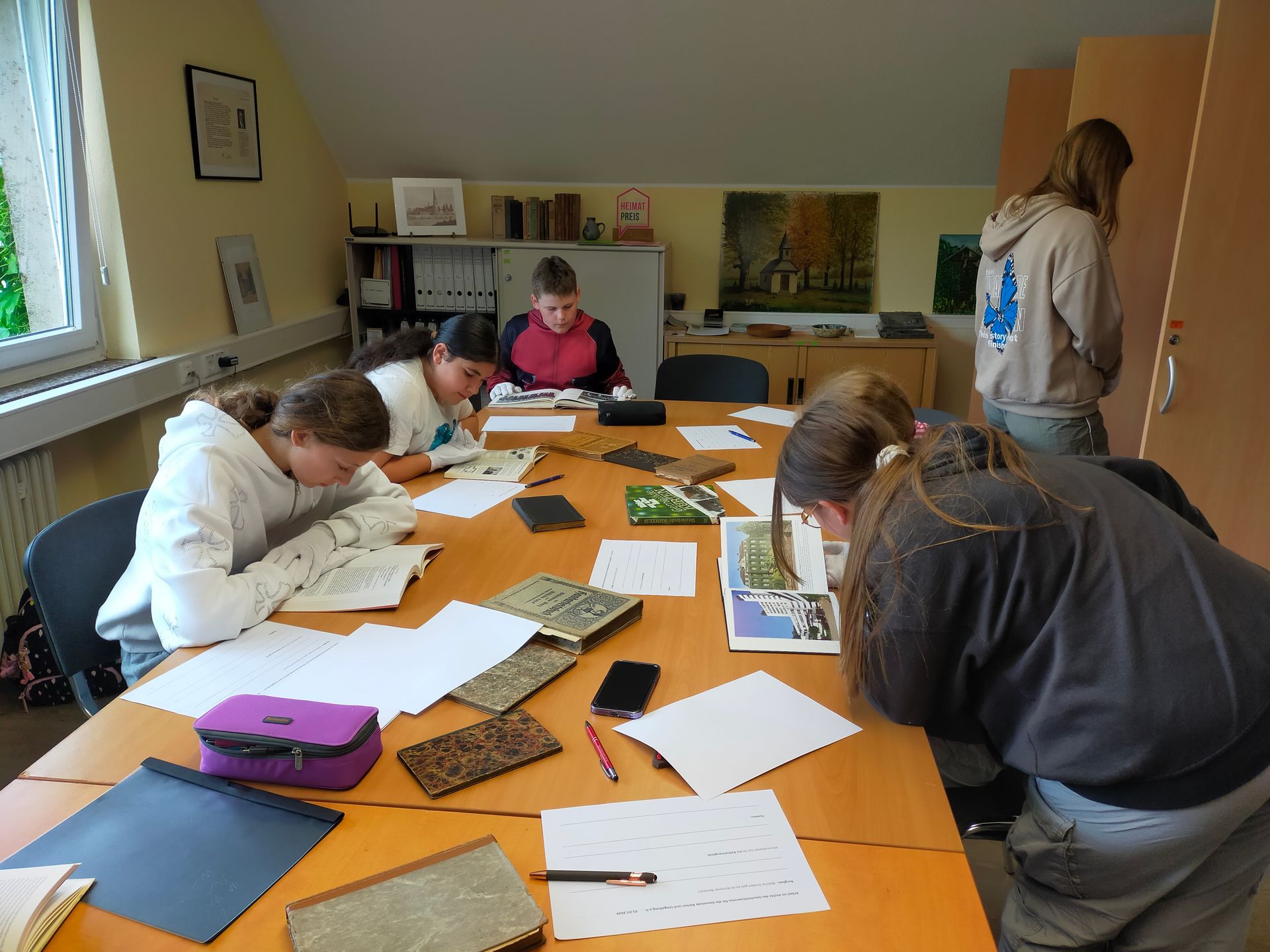 Im Rahmen des Freiday-Projekttages fand sich eine kleine Gruppe von fünf Schülerinnen und einem Schüler mit der Geschichtslehrerin Astrid Wallenfang am 1. Juli in unserem Archiv ein. Sehr interessiert und behutsam schauten sie sich unsere ältesten Schätze und die Bildbände von Kürten in früheren Zeiten an.