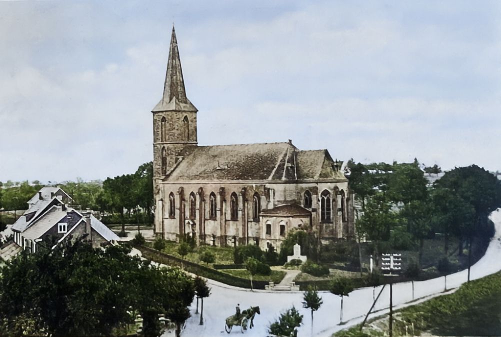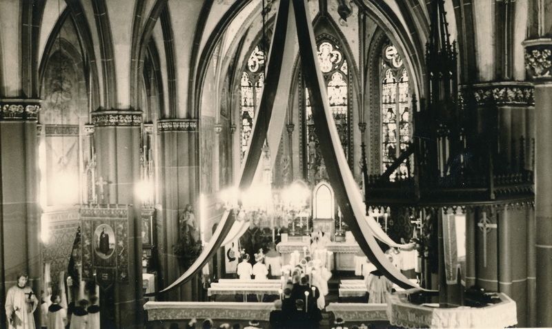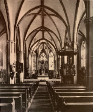 Das neugotische Kirchenschiff wurde wegen Einsturzgefahr in 1974 abgebrochen und durch einen polygonalen, zeittypischen Betonbau an etwa gleicher Stelle ersetzt, der 1977 eingeweiht wurde. Dabei wurden der Chorraum mit den seitlichen Absidien und ihre Altäre erhalten. Neugotische Ausstattungen wurden im Neubau angebracht, wie Glasbilder mit Seligpreisungen (aus 1916-19), Heiligenfiguren und Kreuzweg. Eine der vier Glocken stammt aus 1889, drei Glocken aus 1954, (Neuguss nach Kriegsablieferung).