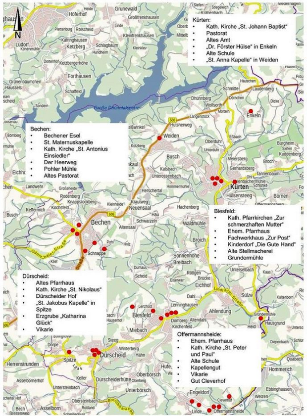 In 2009 hat der Geschichtsverein für die Gemeinde Kürten und Umgebung e.V. im Auftrag der Gemeinde Kürten kulturhistorische Objekte, wie Kirchen und Kapellen, Häuser und Mühlen, Grabsteine und Andachtskreuze erfasst und mit Hilfe der Arbeitsgruppe >Geschichte / Kulturhistorie Leitbild Kürten 2020 < in der Broschüre „Von Wegekreuzen, Mühlen und Dolinen“ zusammengestellt.