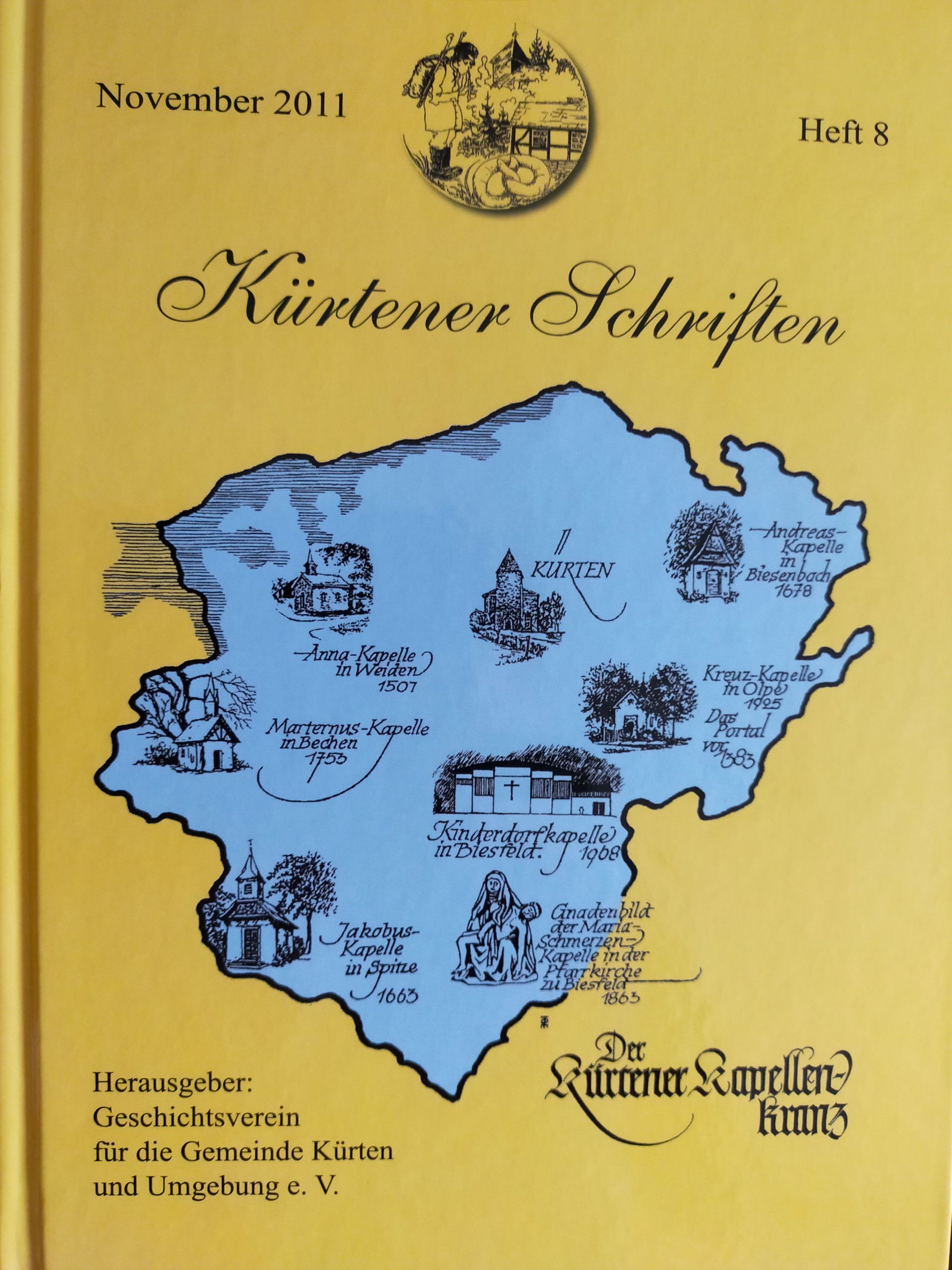 Noch ausführlicher beschäftigen sich die Kürtener Schriften 8 mit dem Kürtener Kapellenkranz. So hatte der Heimatforscher Franz Toenniges die sieben Kapellen bezeichnet. Er zählte auch die Wallfahrtskapelle in der Biesfelder Kirche dazu sowie die Adelheid-Kapelle auf dem Gelände des Heilpädagogischen Kinderdorfs Die gute Hand. Auch dieses Buch kann bei uns erworben werden.