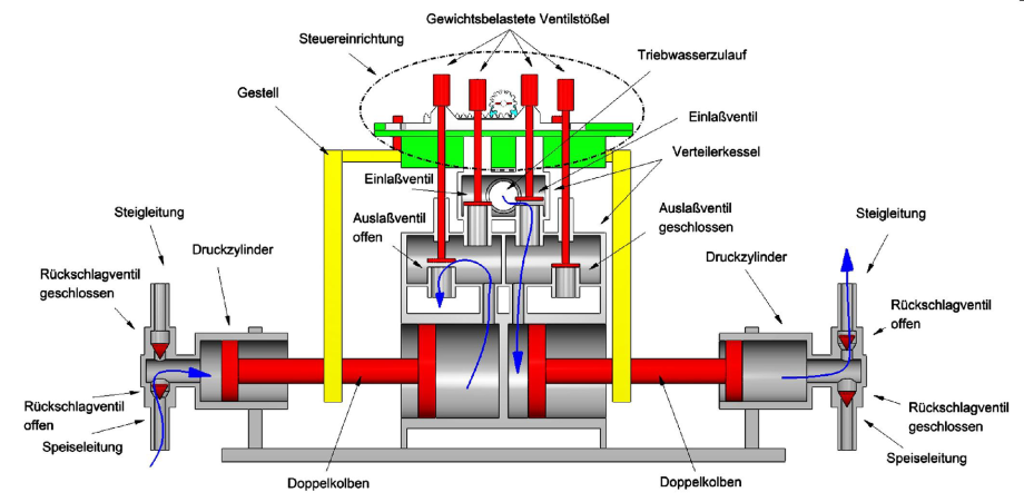 Es ist beeindruckend zu sehen, wie die Pumpe anläuft und die beiden Kolben sich fast geräuschlos gemächlich hin- und herbewegen. Ein Teil des geförderten Wassers wird nach draußen geleitet und treibt dort als optischen Blickfang ein kleines oberschlächtiges Wasserrad an. Der größte Teil des Wassers wird aber wieder der nahen Wipper zugeführt, aus der auch das Triebwasser einige zehn Meter oberhalb des Pumpenhauses abgeleitet wird