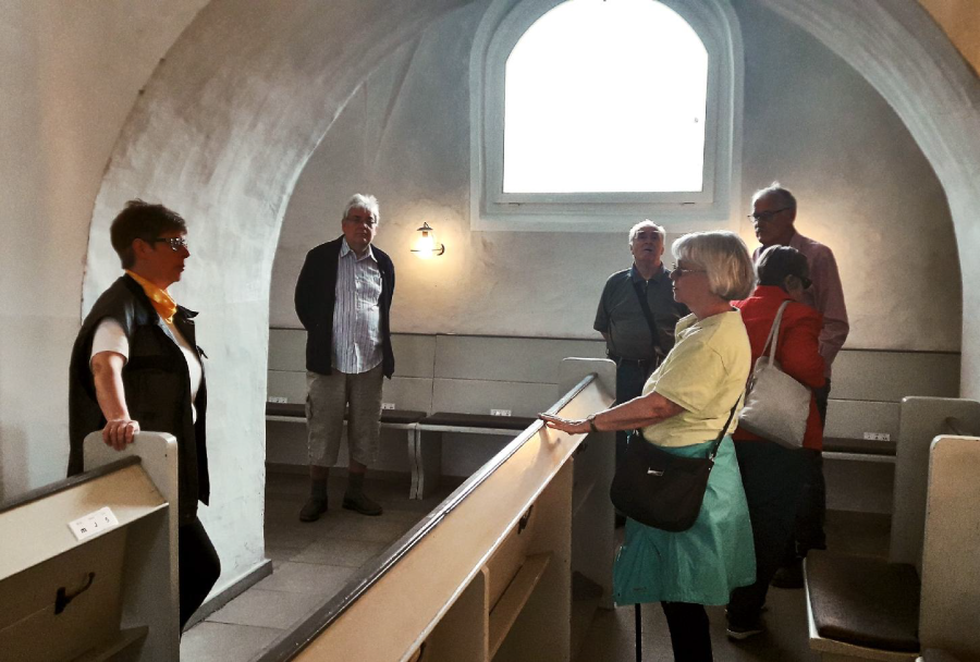 Nach dieser sehr anschaulichen Demonstration einer Lambach-Pumpe fahren wir weiter nach Müllenbach, einem ehemals eigenständigen Örtchen, das heute zur Stadt Marienheide gehört. Dort empfängt uns Frau Sonja Denke, die Küsterin der Wehrkirche, die zu den