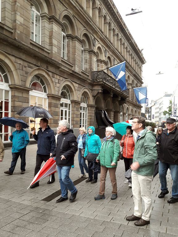 Neben ausführlichen Erläuterungen zu den "großen" Sehenswürdigkeiten zeigte uns unser Stadtführer aber auch die kleinen Besonderheiten am Rande, wie die ortstypischen Originale "Mina Knallenfalls" oder den "Zuckerfritz" und er gab auch manche Anekdote zum Besten.