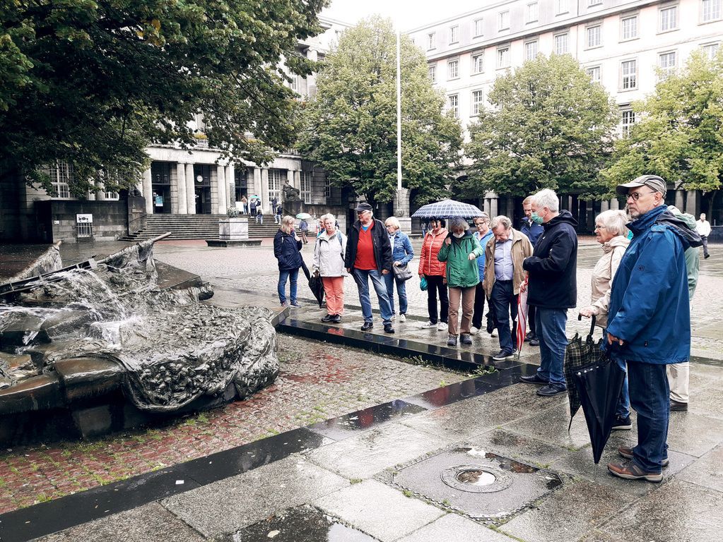 Dann führte uns Ralph Knapp durch die beiden Zentren im Tal, nämlich durch Elberfeld und anschließend durch Barmen. In Elberfeld betrachteten wir auf dem Weg z. B. den Hauptbahnhof, die City-Kirche, das von-der-Heydt-Museum, das Armenpflege-Denkmal, den Jubiläumsbrunnen, das ehemalige (neue) Elberfelder Rathaus und die Kirche St. Laurentius.